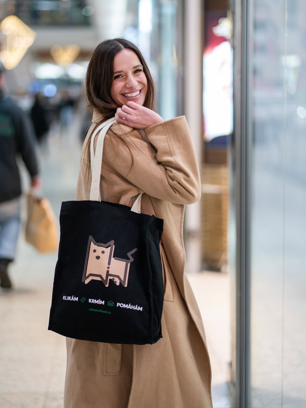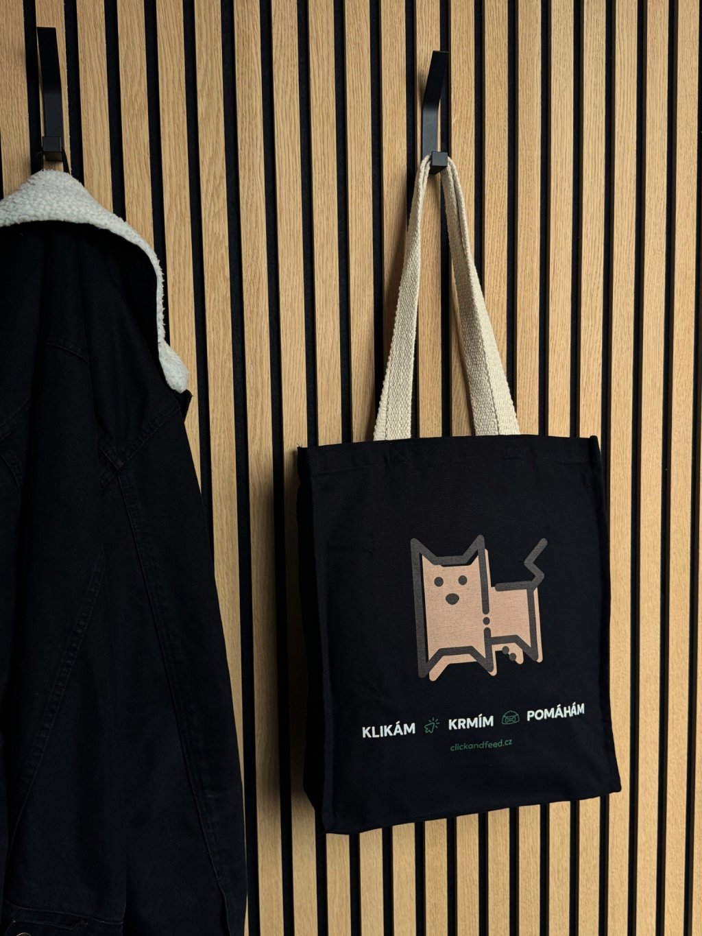 Na přední straně pak najdeš naše maskoty z loga – pejska nebo kočičku 🐶🐱 a nápis „klikám, krmím, pomáhám“. Protože ty nejen že s námi klikáš a plníš mističky chlupáčům. Nákupem téhle tašky navíc i pomáháš finančně zvířátkům v útulcích, protože celý výtěžek jde právě na ně! ❤️
