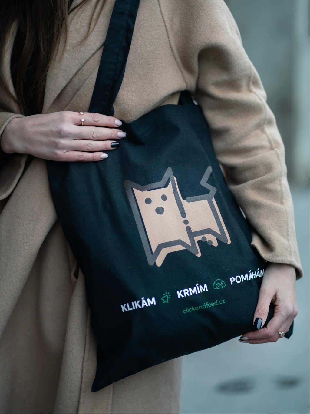 Na přední straně pak najdeš naše maskoty z loga – pejska nebo kočičku 🐶🐱 a nápis „klikám, krmím, pomáhám“. Protože ty nejen že s námi klikáš a plníš mističky chlupáčům. Nákupem téhle tašky navíc i pomáháš finančně zvířátkům v útulcích, protože celý výtěžek jde právě na ně! ❤️